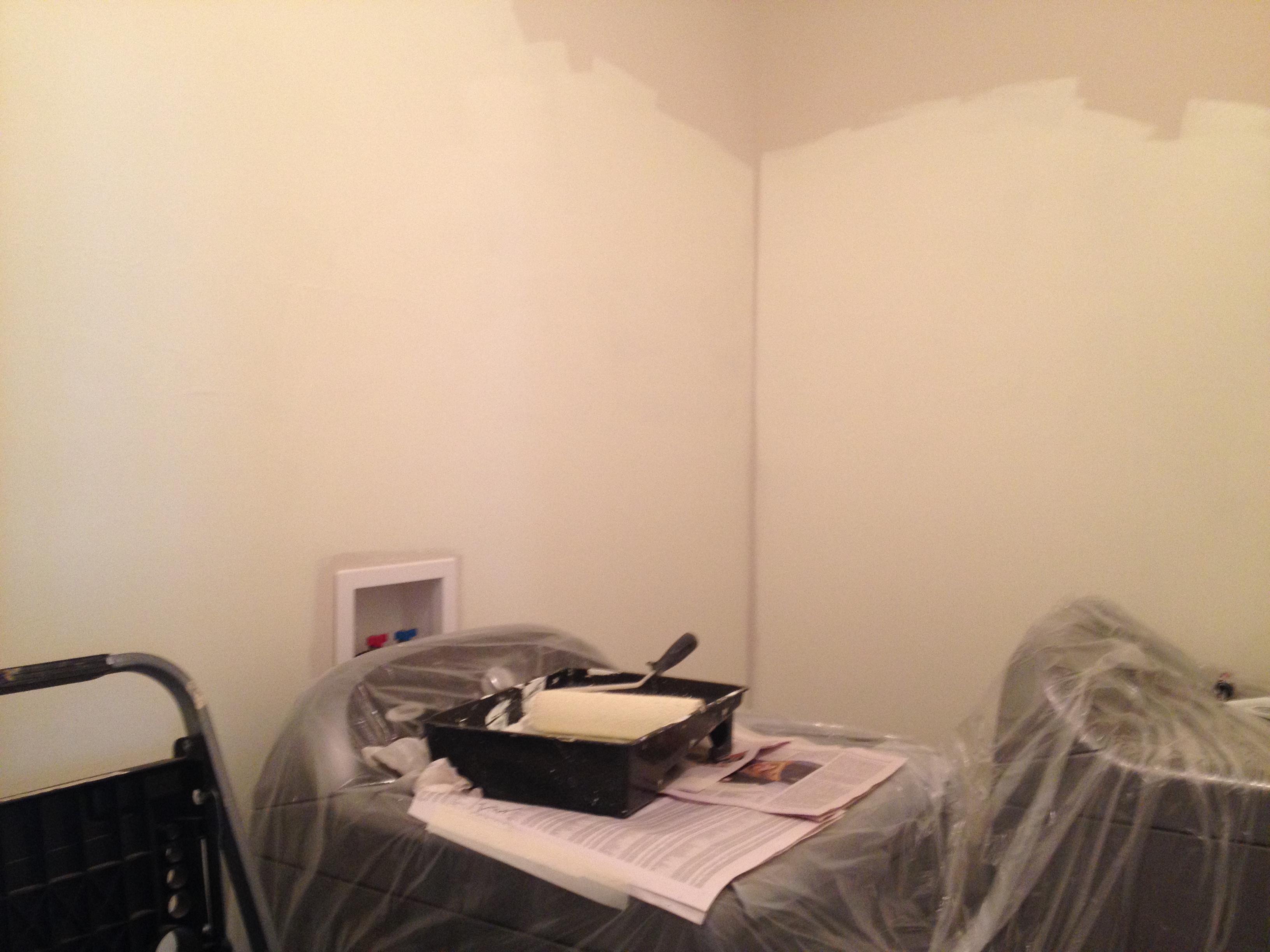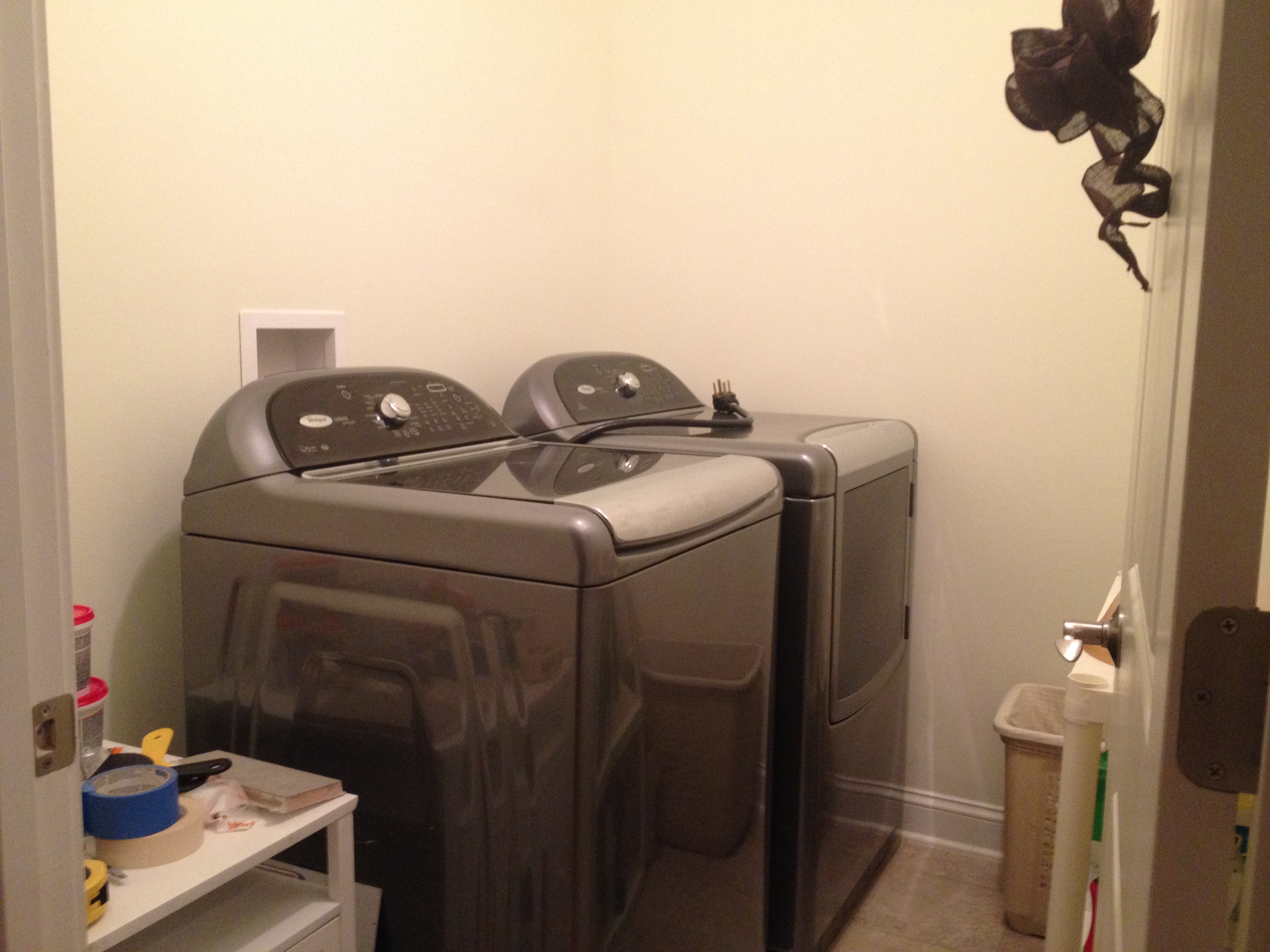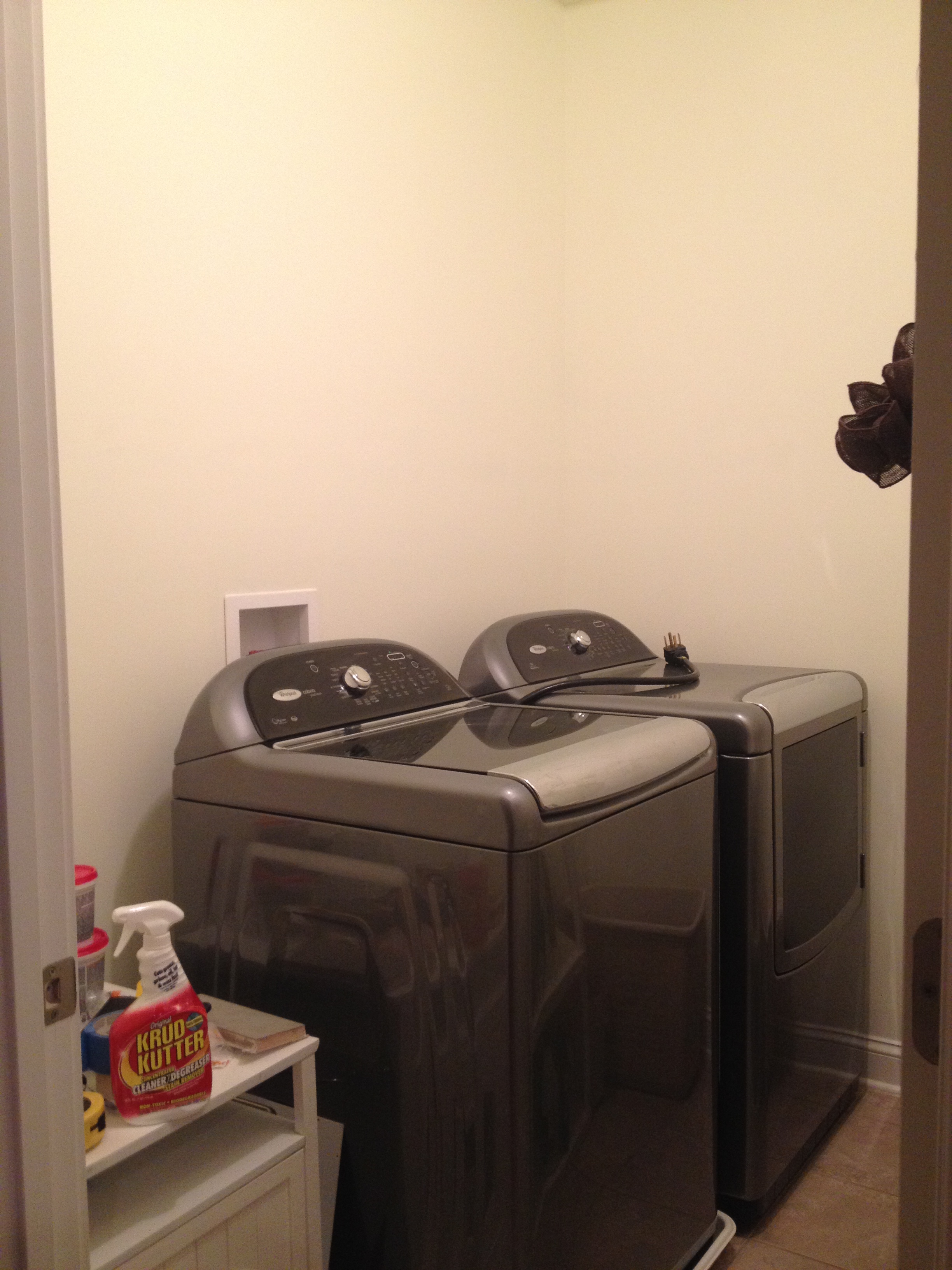 Here is an almost before picture of my laundry room.  There was a shelf covered with laundry supplies and pretty much a lot of junk that accumulates in a laundry room.  IMG_2429 IMG_2431