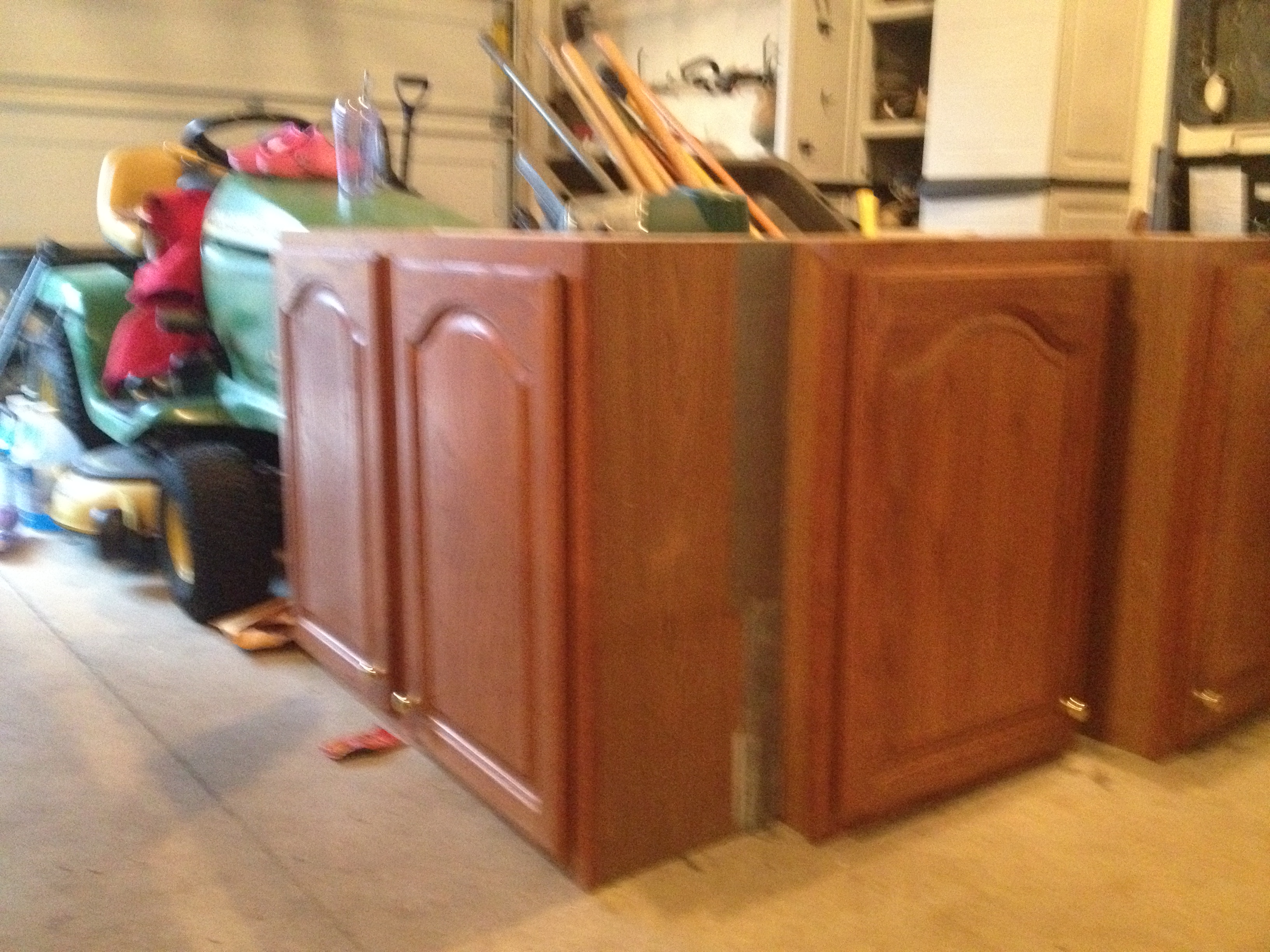 When I realized that putting up cabinets from Lowes or Home Depot would run about $900+ (for all the cabinets I wanted), I decided I would try something new (for me):  I went on Craig’s List!    I always read about people finding this great stuff on Craig’s List, so now I had the opportunity to see what all the hype was!  Well the first few times I only came across dealers who were selling new cabinets, then I found a guy about 2 hours from me that had these old beat up cabinets that definitely could have been redone and made beautiful, but he was asking $150 per cabinet (there were 3), so I still thought pretty pricey.  I gave it a few more days and went back on and found a woman who was redoing her kitchen and wanted $400 for all the cabinets.  I asked her for only the upper cabinets and we settled on $200 for all 4 upper cabinets!