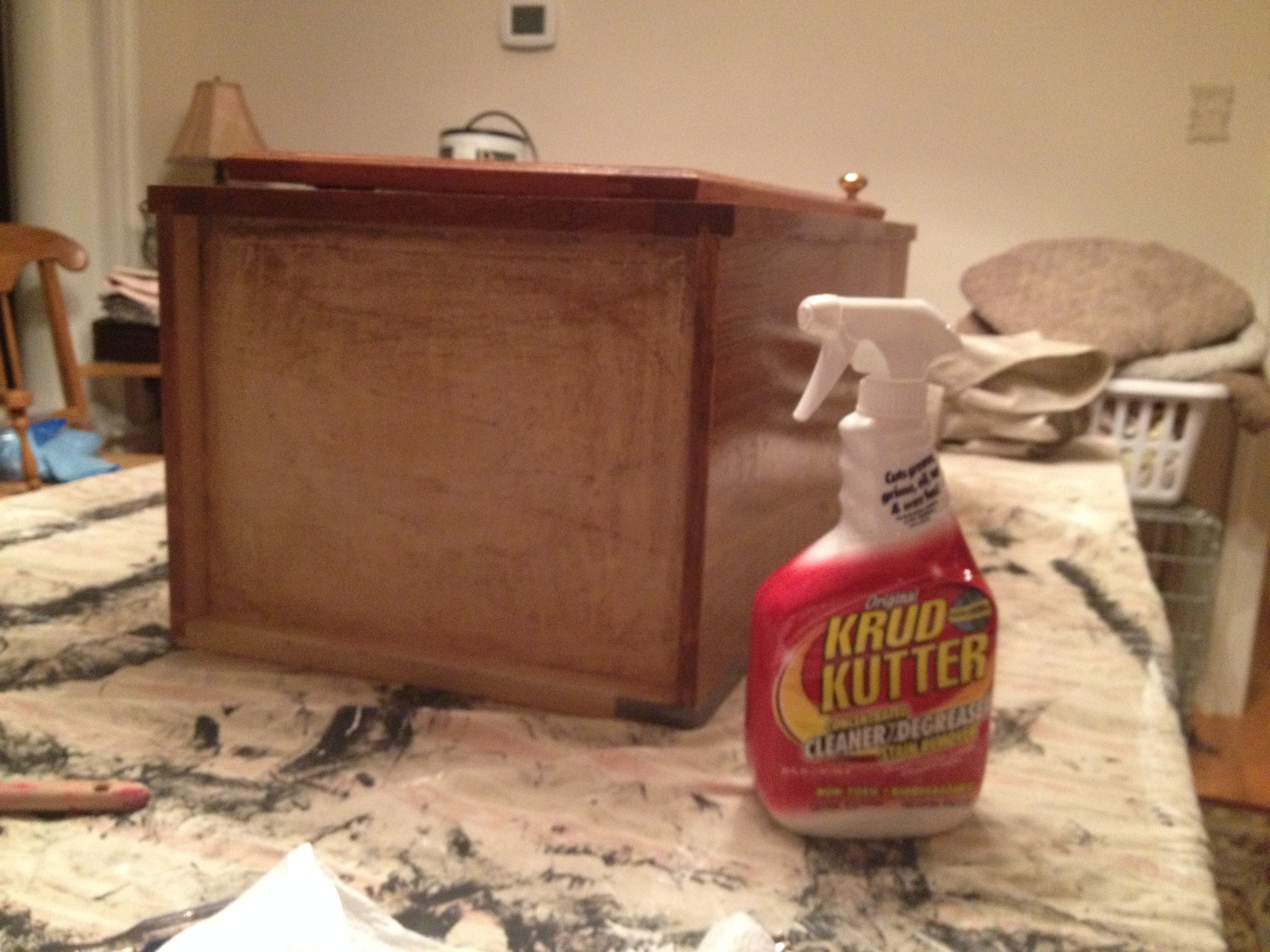 IMG_2447 IMG_2448 IMG_2450Since these were kitchen cabinets, you really need to clean them before painting (lots of grease in the wood) so I found this GREAT PRODUCT called Krud Kutter and it made the wood like new :)!!IMG_2449Using my favorite paint for furniture, Annie Sloan’s Chalk Paint, I painted all the cabinets Old White and finished them with clear wax.  After about a day or two, they paint and wax was pretty set and with a little help from my husband and his stud finder and level, we installed the new cabinets!